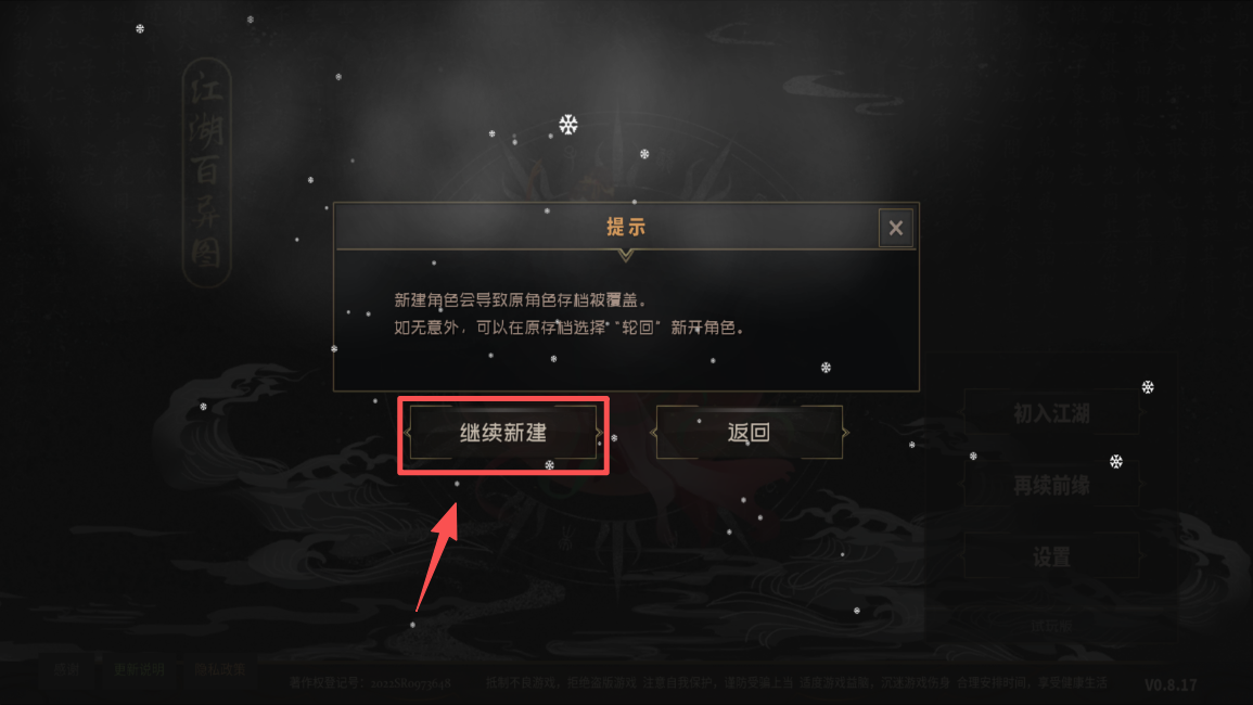 2、接着,选择“继续新建”以创建新的角色,开始你的江湖之旅。
