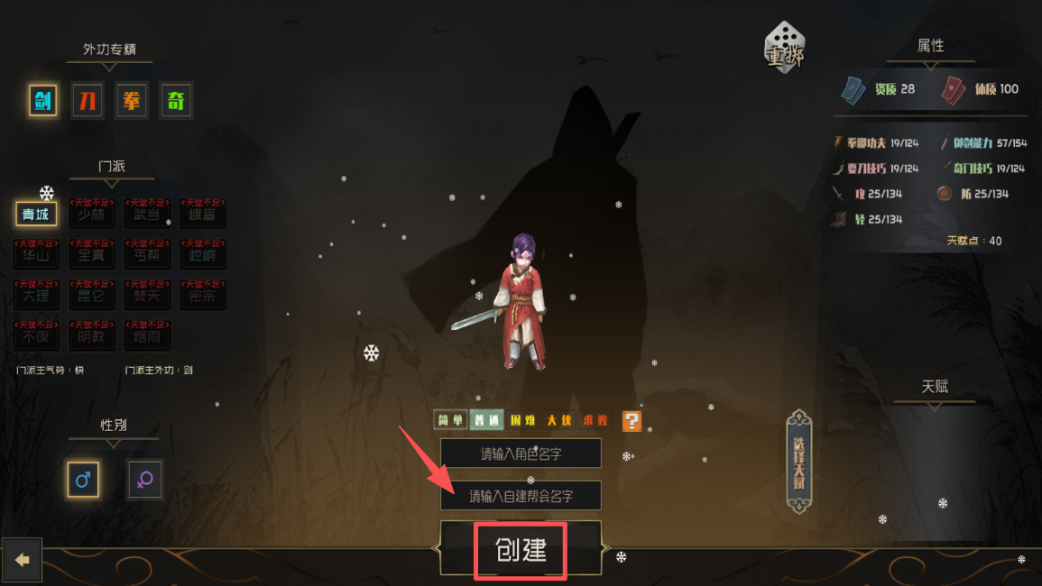 4、最后,输入角色名字和自建帮会名字,点击“创建”完成角色创建。