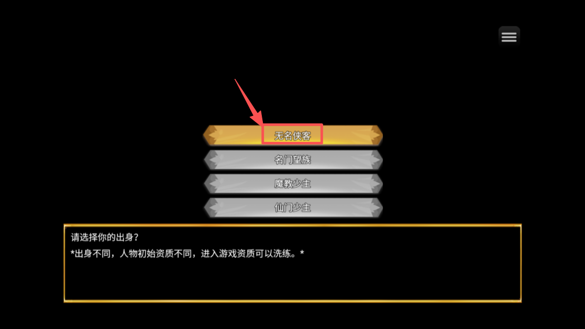 2、选择角色出身,点击“无名侠客”或其他选项来确定角色背景。