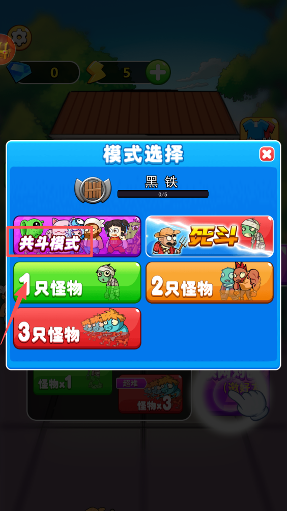 2、接着,在模式选择界面,选择“共斗模式”,以及怪物数量。