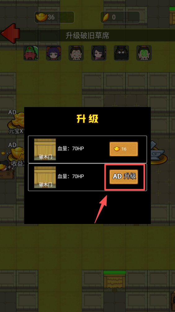 4、点击“升级”按钮,使用元宝提升防御设施的血量,增强防御能力。