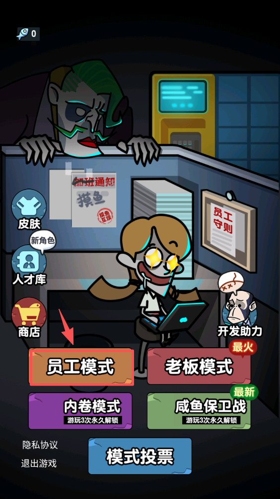 1、在主界面点击“员工模式”或“老板模式”开始游戏。