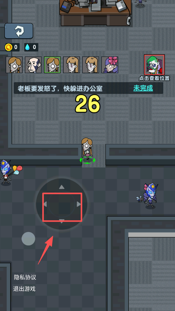 3、在办公室界面,使用虚拟摇杆控制角色躲避老板的追捕。