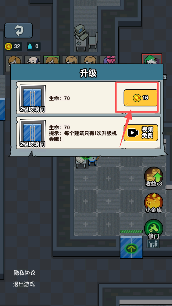 4、在升级界面,点击“视频免费”按钮,观看视频以免费升级设施。