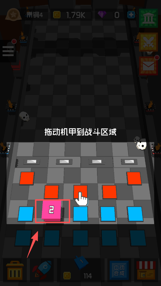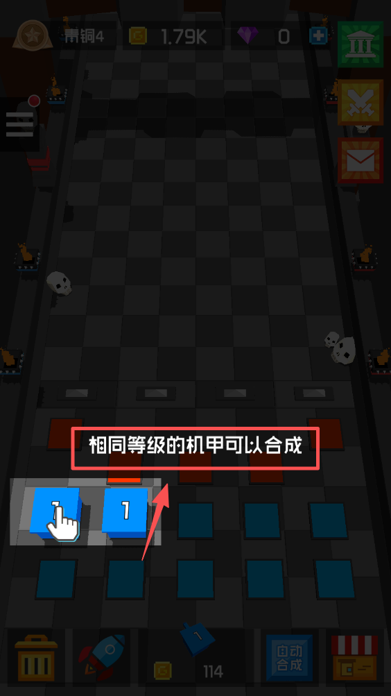 2、将相同等级的机甲拖动到一起,合成更高级的机甲,增强防御力。