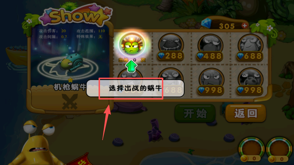 1、点击“选择出战的蜗牛”按钮,挑选你的蜗牛进行战斗。