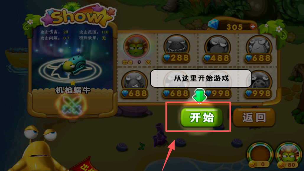 1、进入游戏后,玩家先从多种蜗牛英雄中挑选成员,依据技能互补原则组建战队,为防御战打下基础。