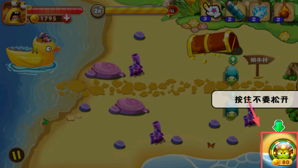 3、在战斗界面,按住蜗牛图标并拖动,控制蜗牛移动和攻击。