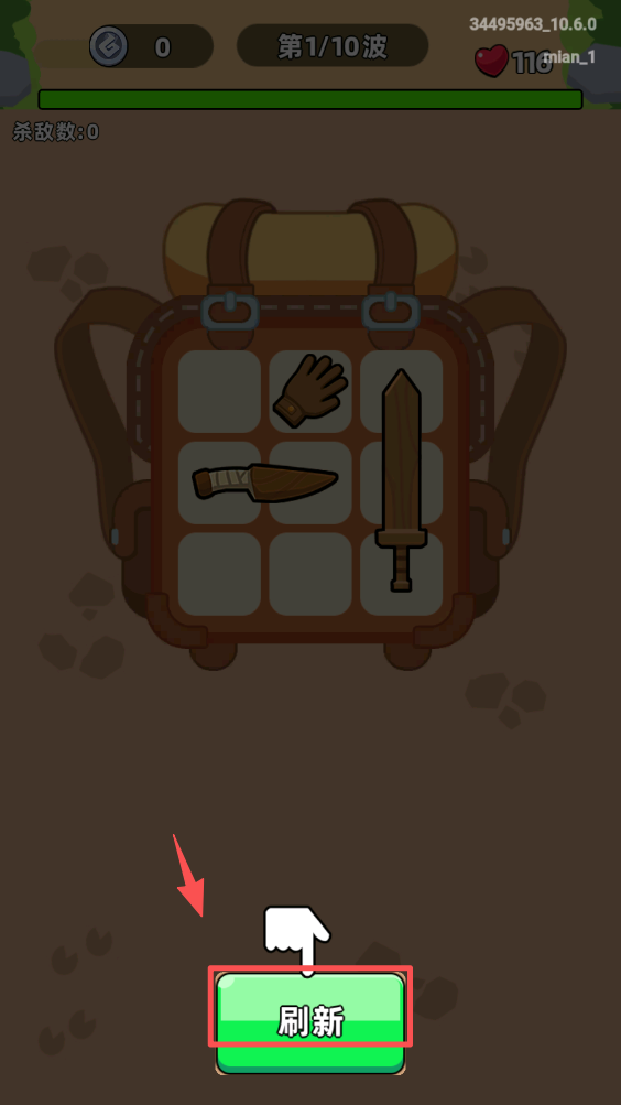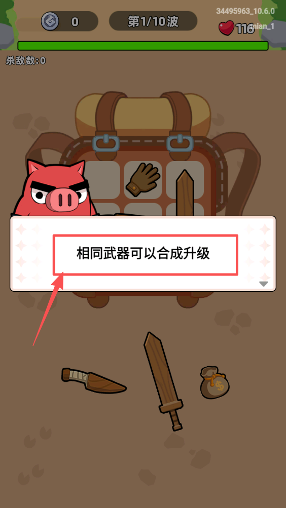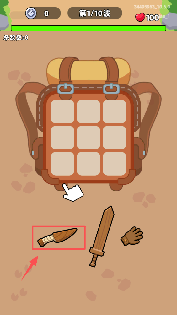 2、进入游戏后,点击箭头指向的武器,将其放入背包。