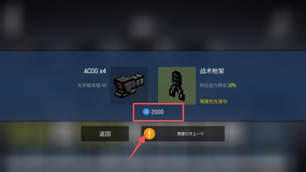 4、在装备购买界面,点击“需要打开上一个”按钮,解锁新装备。