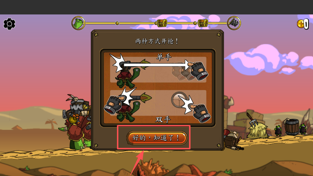 3、在教学界面,学习单手或双手开枪的操作方式,点击“好的,知道了!”继续。