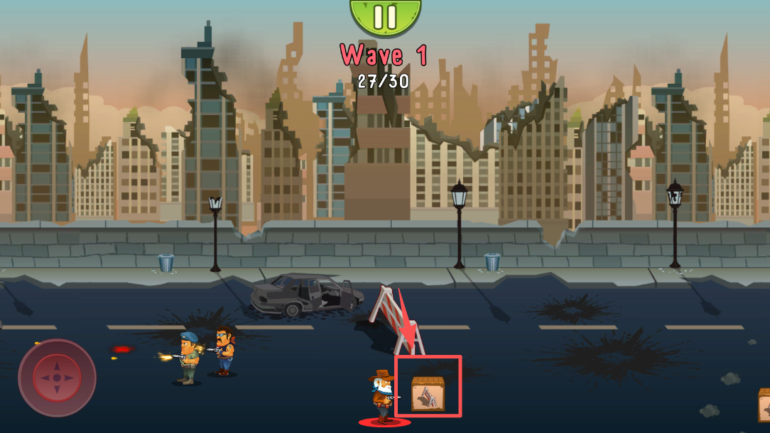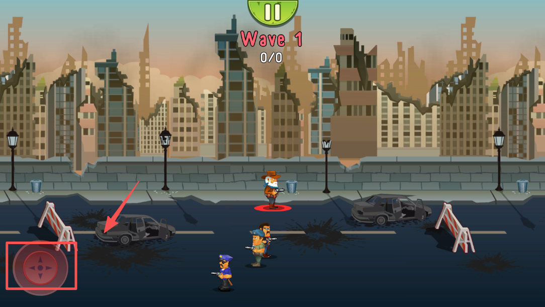 3、使用虚拟摇杆控制角色移动,寻找并消灭僵尸。