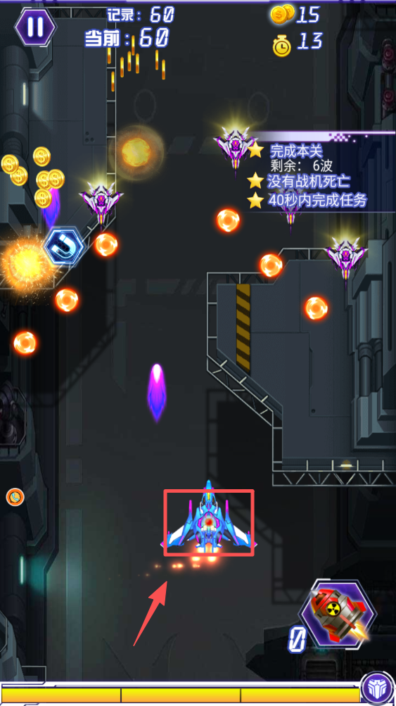 3、在游戏中,控制你的战机移动并攻击敌人,收集奖励。