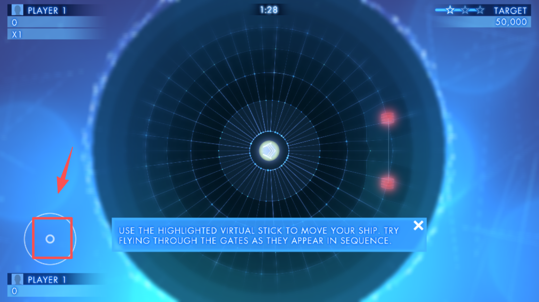 3、根据屏幕提示,使用虚拟摇杆控制飞船,通过按顺序穿越门。