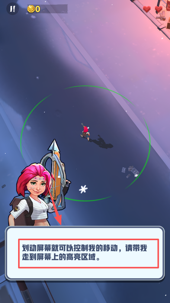 1、通过滑动屏幕来控制角色移动,将角色移动到屏幕上的高亮区域。