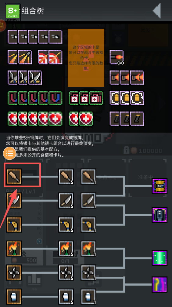 3、在组合树界面,选择并升级你的装备和技能,为战斗做准备。