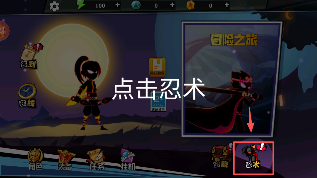 1、首先,点击主界面的“忍术”按钮,进入忍术选择界面。