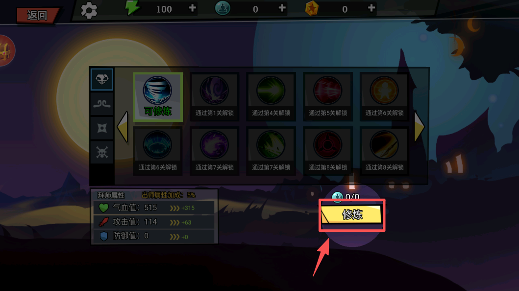 2、接着,在忍术界面选择并修炼可用的忍术技能,提升角色能力。