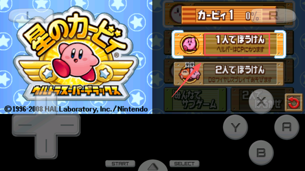 3、选择“1人でぼうけん”开始单人游戏,或选择“2人でぼうけん”进行双人游戏。