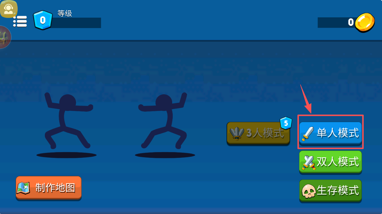 1、选择游戏模式。点击“单人模式”按钮,选择你的游戏模式。