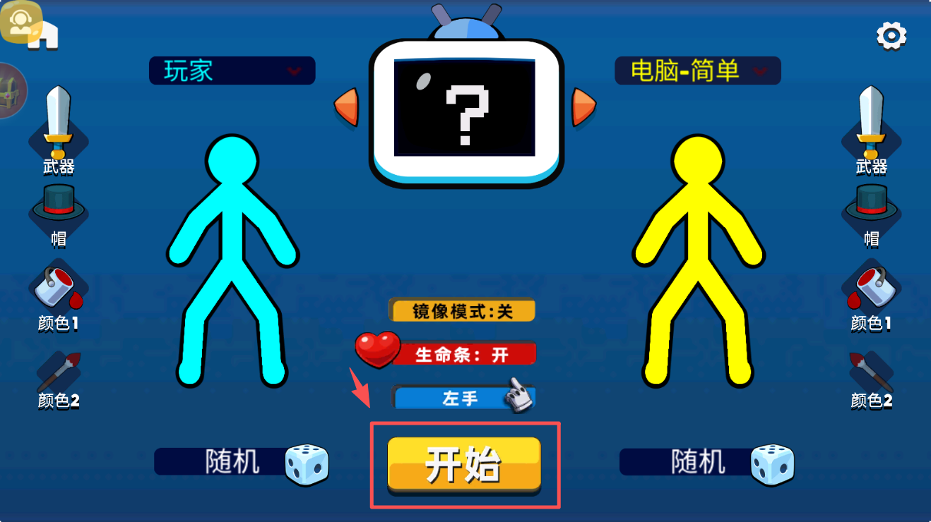 2、设置角色。在角色设置界面,选择你的武器、帽子和颜色,点击“开始”按钮。