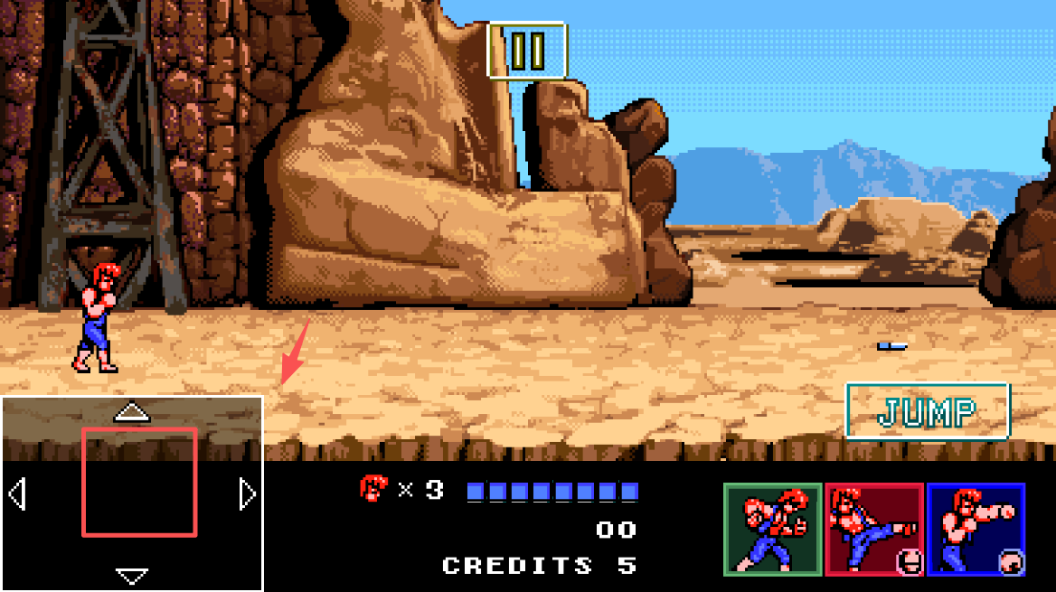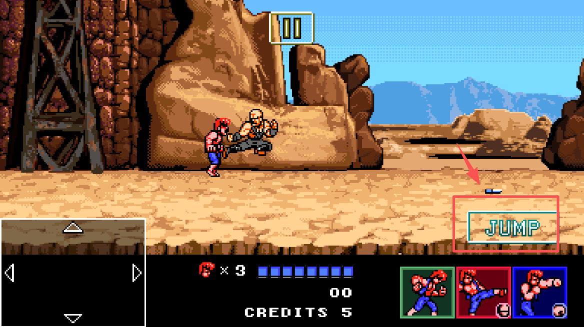 4、最后,当遇到敌人时,利用“JUMP”按钮进行跳跃攻击,击败对手,继续前进。