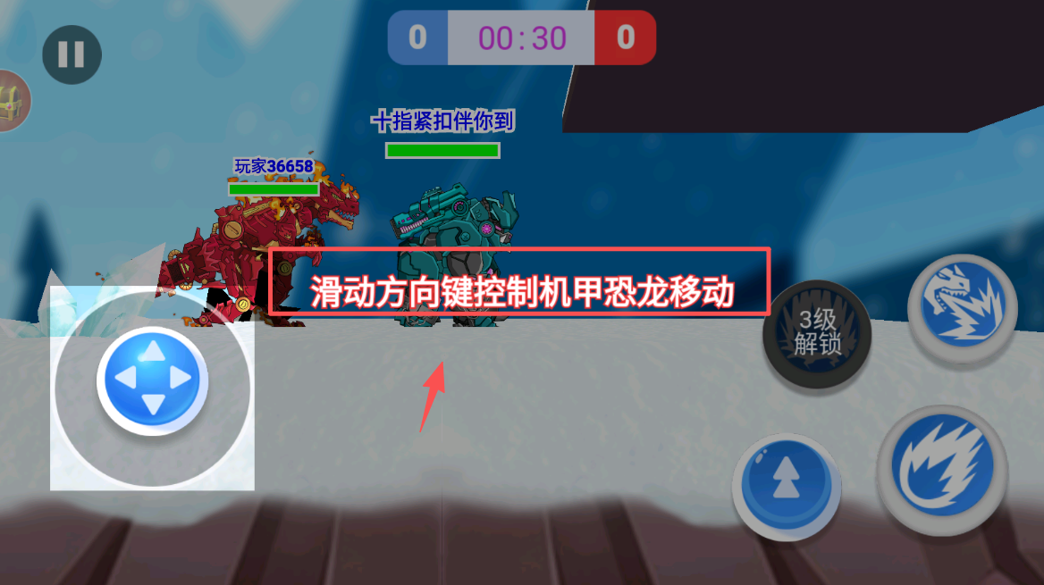 2、然后,滑动方向键控制机甲恐龙移动,避开障碍物,寻找敌人,进行战斗。