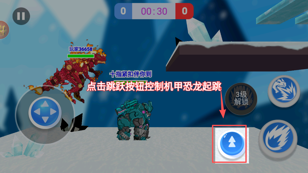 3、接着,点击跳跃按钮控制机甲恐龙起跳,越过障碍,利用跳跃到达更高的地方。