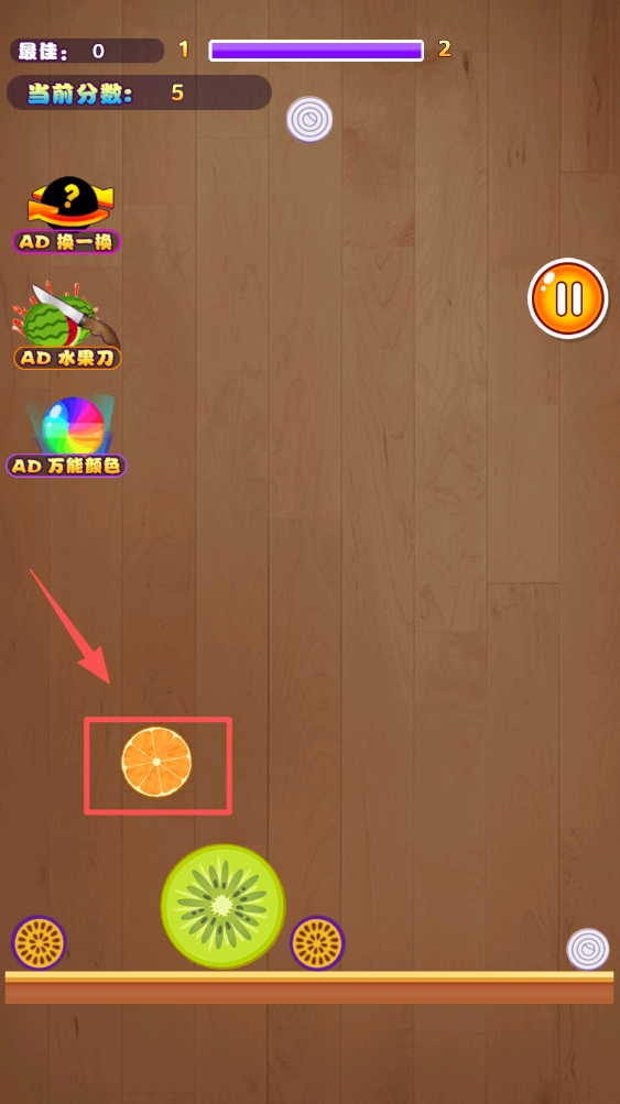 2、接着,在游戏界面中点击橙色方块,合并相同的水果,获取分数,体验消除乐趣。