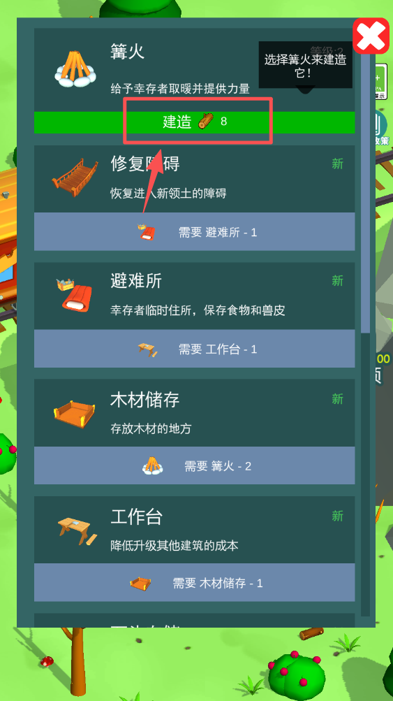2、接着,点击“建筑”按钮,升级篝火,让幸存者保持温暖,确保夜间安全。