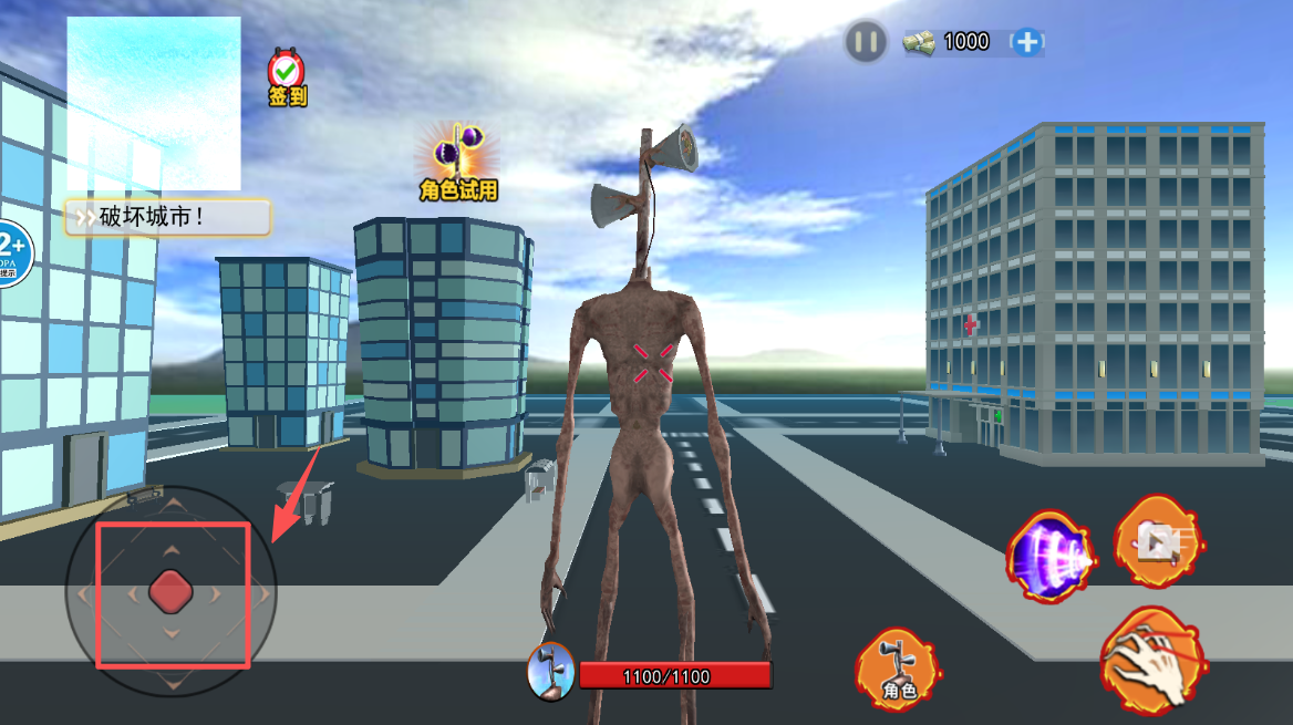 2、接着,使用虚拟摇杆控制角色移动,探索城市,寻找可破坏的目标。