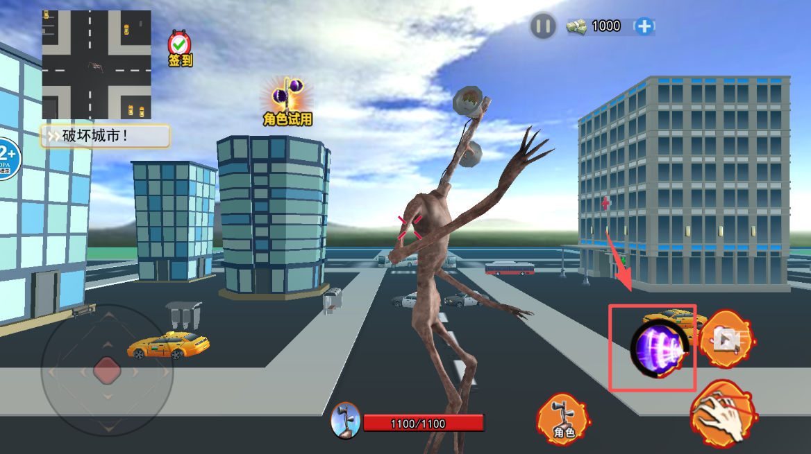 3、然后,点击技能按钮释放特殊攻击,对城市建筑进行破坏,增加你的破坏分数。