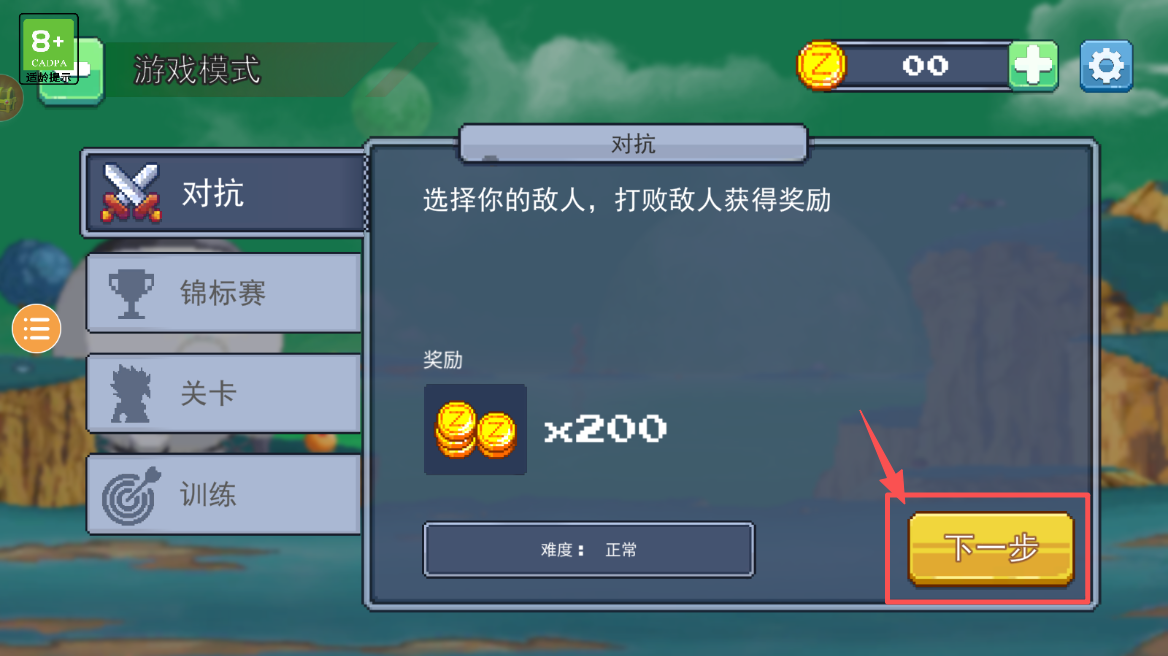 2、接着,选择“对抗”模式,点击“下一步”按钮,准备进入战斗。