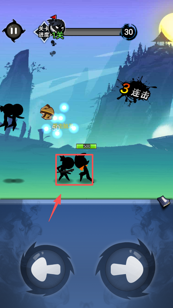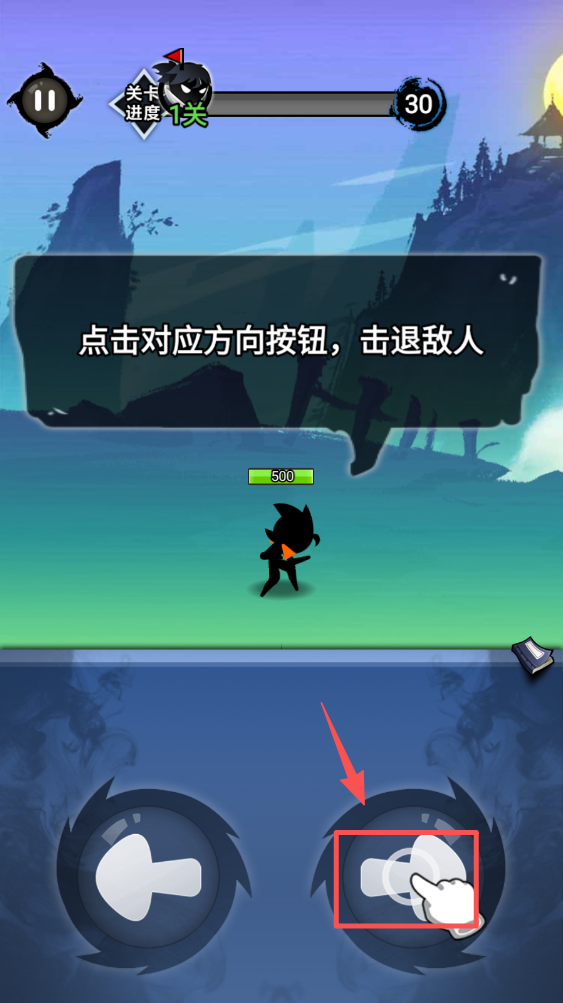 1、点击屏幕下方的左右按钮,控制角色移动,击退敌人。注意观察敌人动向,及时反应。