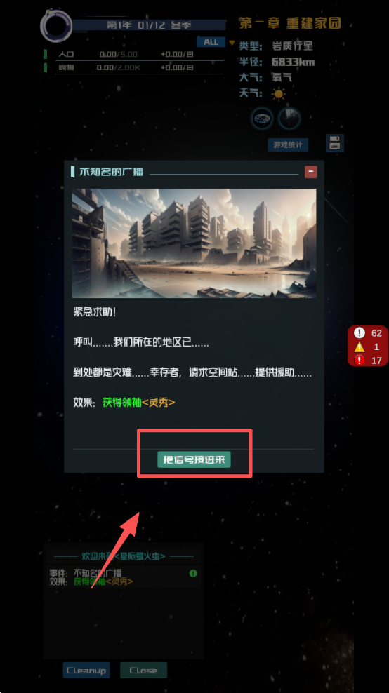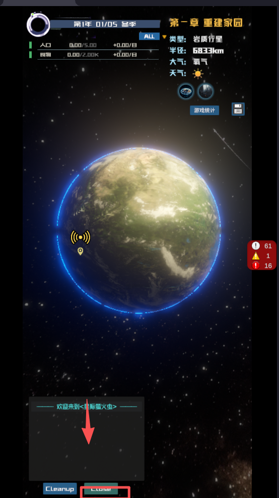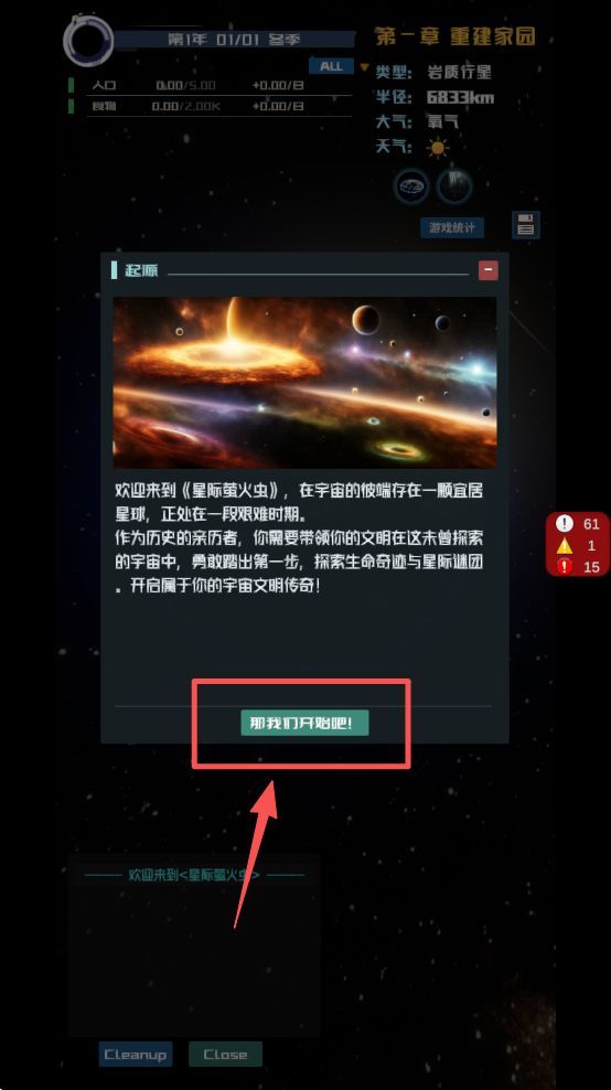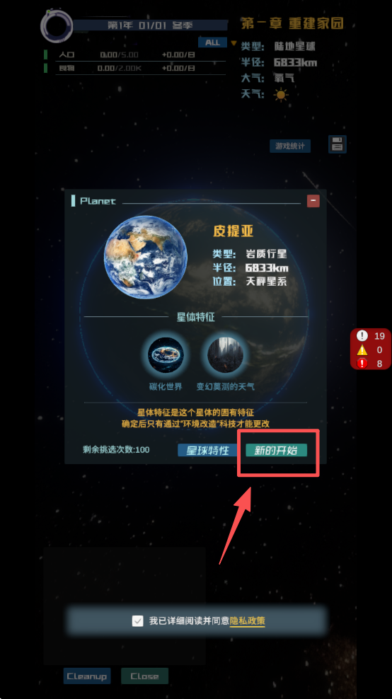 1、点击“新的开始”按钮,选择星球并开始你的星际冒险。