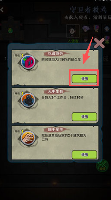 3、然后,点击技能选择界面的“使用”按钮,激活你的技能,增强战斗力。