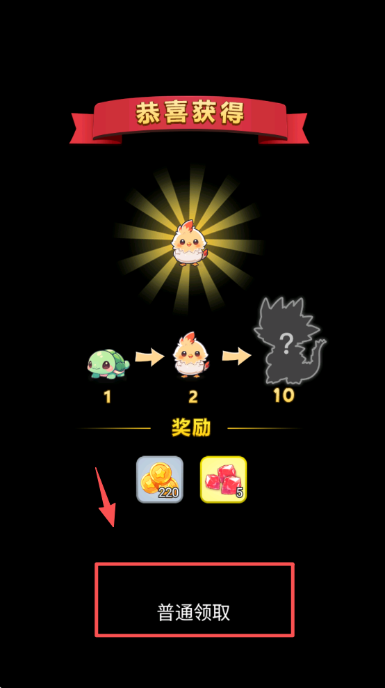 3、在合成成功后,点击“普通领取”按钮获取奖励,包括金币和道具。