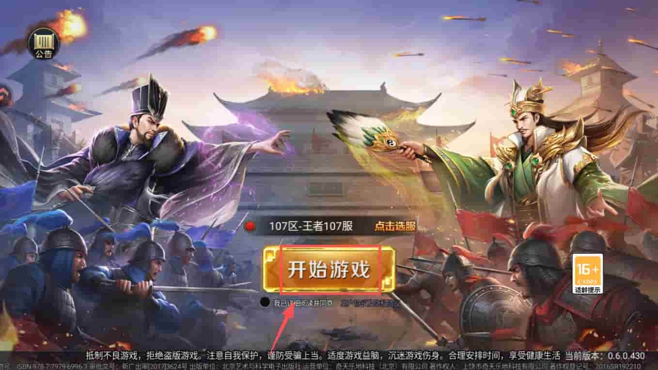 1、点击“开始游戏”按钮进入游戏,选择服务器后开始你的三国之旅。