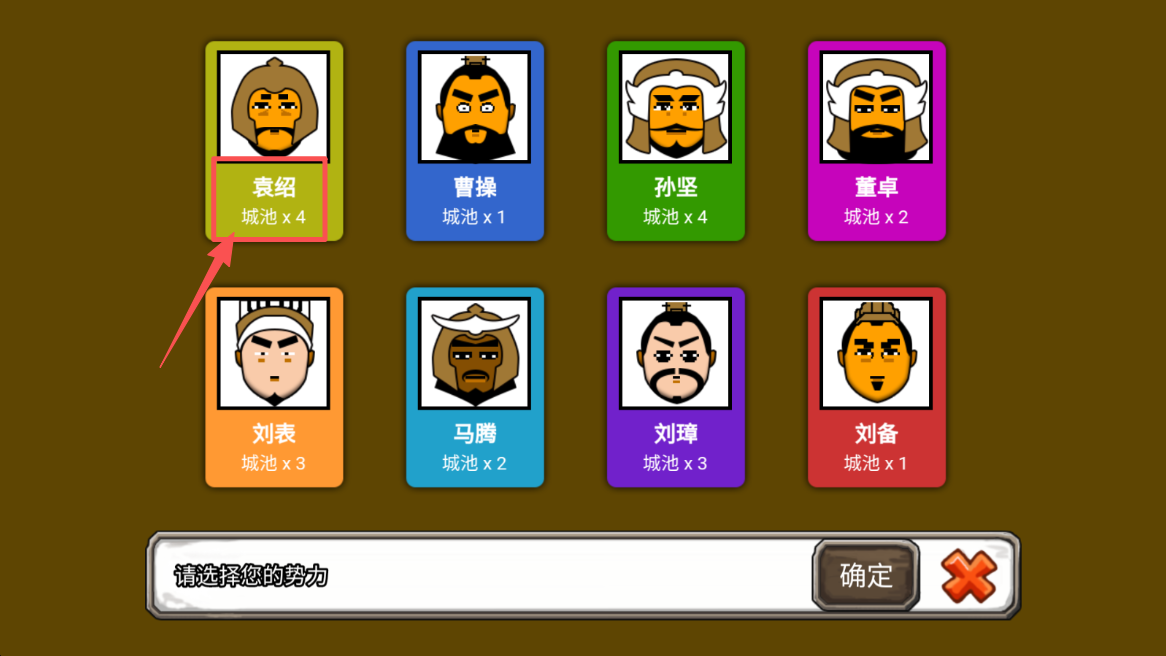 2、在势力选择界面,点击你偏好的势力,如“袁绍”,确定你的游戏起点。