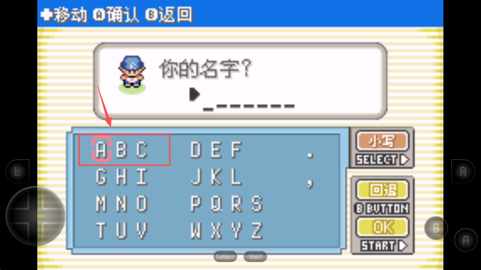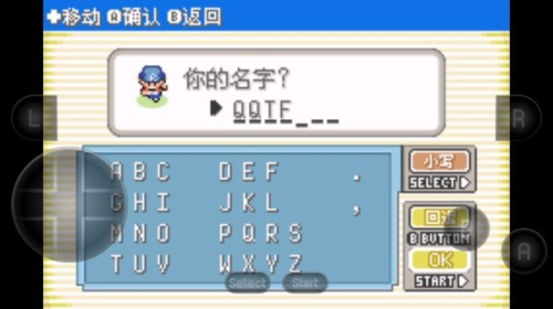 4、输入你的角色名字,使用键盘选择字母并按“OK”确认。