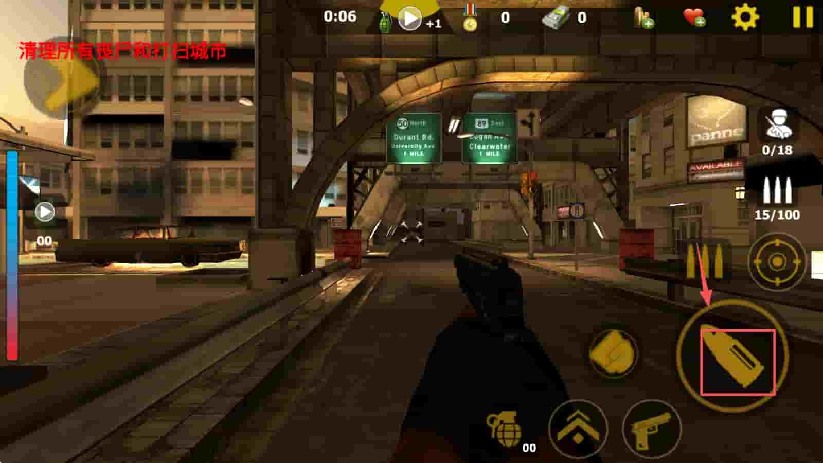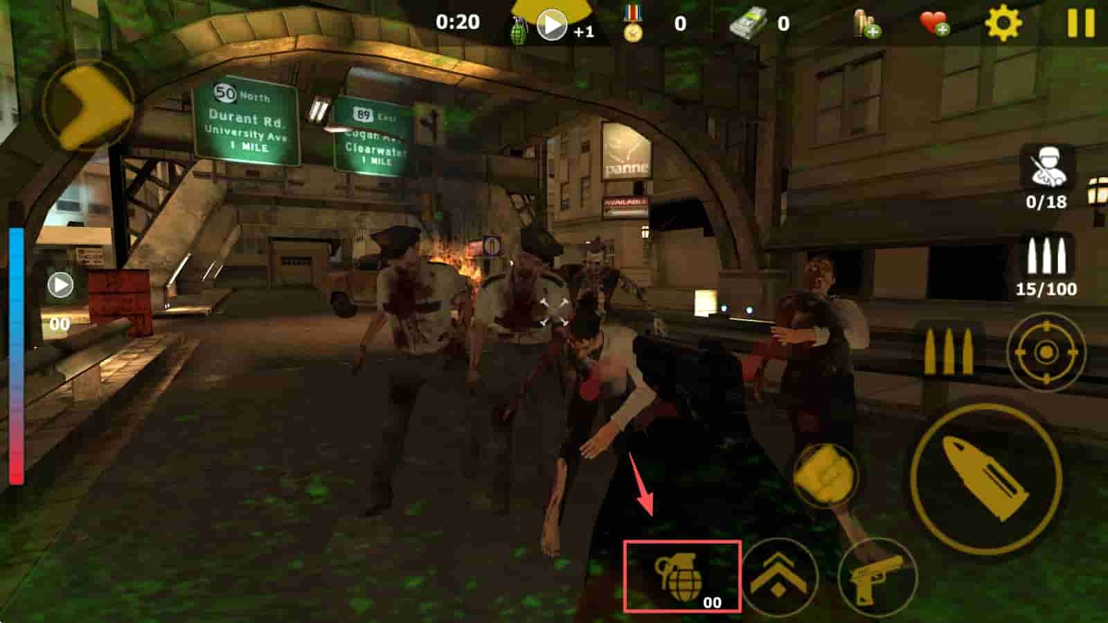 3、使用虚拟摇杆和射击按钮控制角色移动和攻击,消灭僵尸。