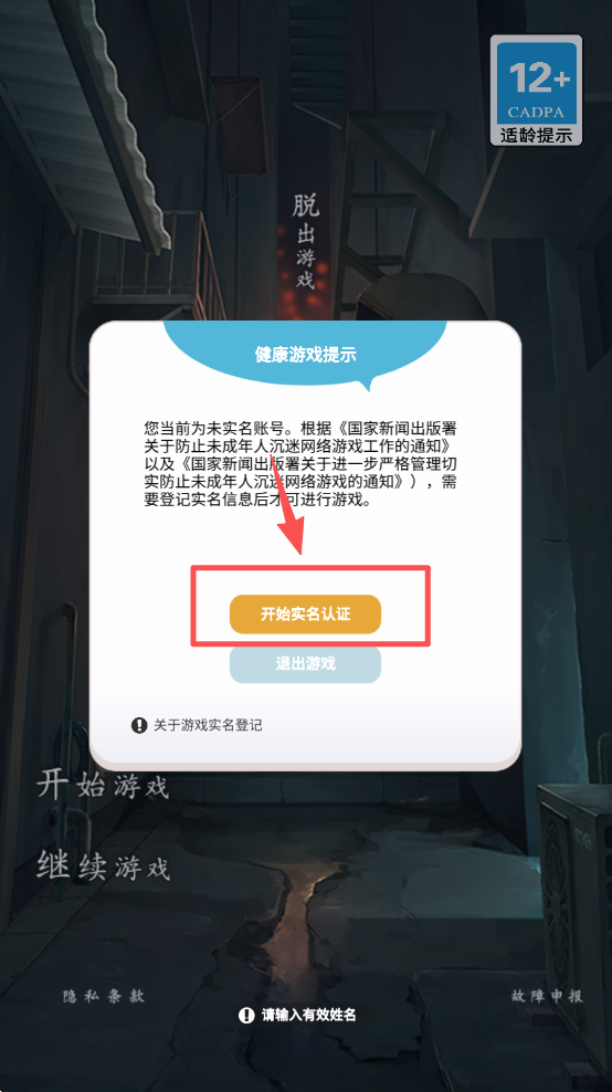 1、看到健康游戏提示弹窗,点击标红的 “开始实名认证” 按钮,完成认证后才能进入游戏。