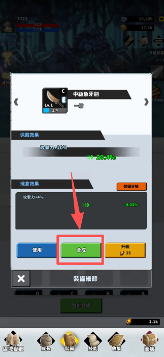 3、然后,在装备界面中,选择并合成更高级的装备,提升角色属性。