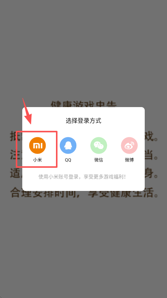 1、登录游戏账号。选择小米、QQ、微信或微博登录,进入游戏。