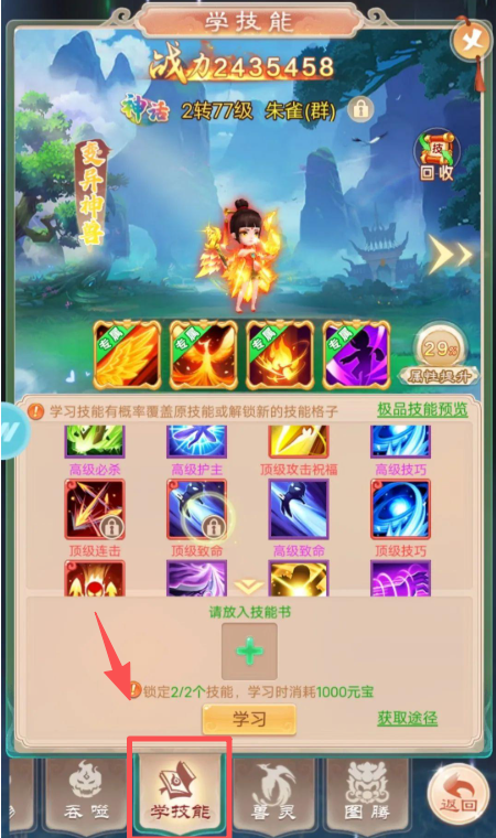 4、学习角色技能。在学技能界面选择技能书,点击学习,提升角色能力。
