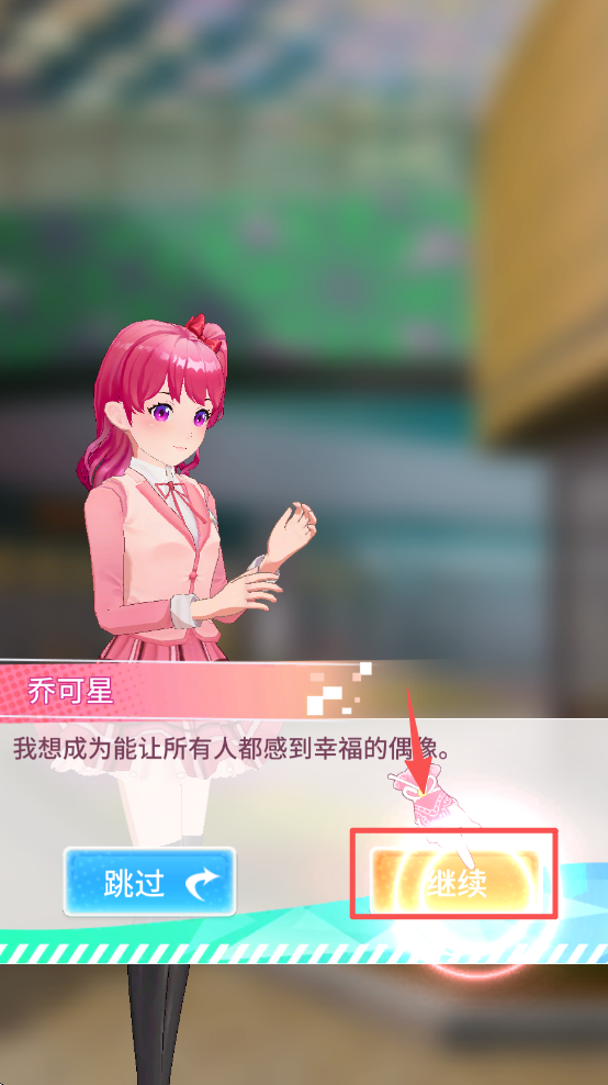 2、在对话界面,点击“继续”按钮,推进游戏剧情发展。