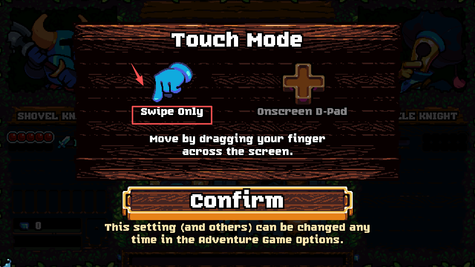 1、在“Touch Mode”界面选择“Swipe Only”以滑动屏幕来控制角色移动。
