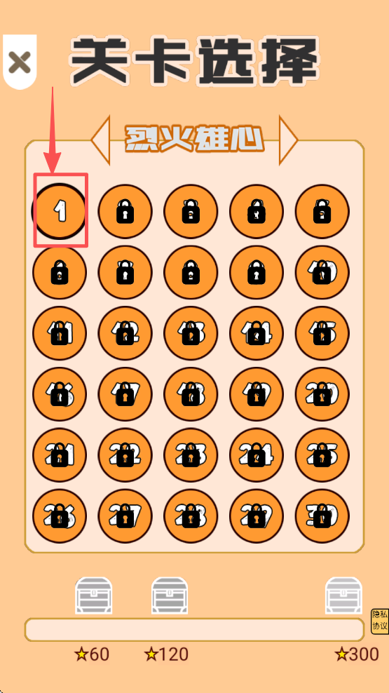 2、接着,在关卡选择界面点击“1”号关卡,选择你要挑战的关卡。