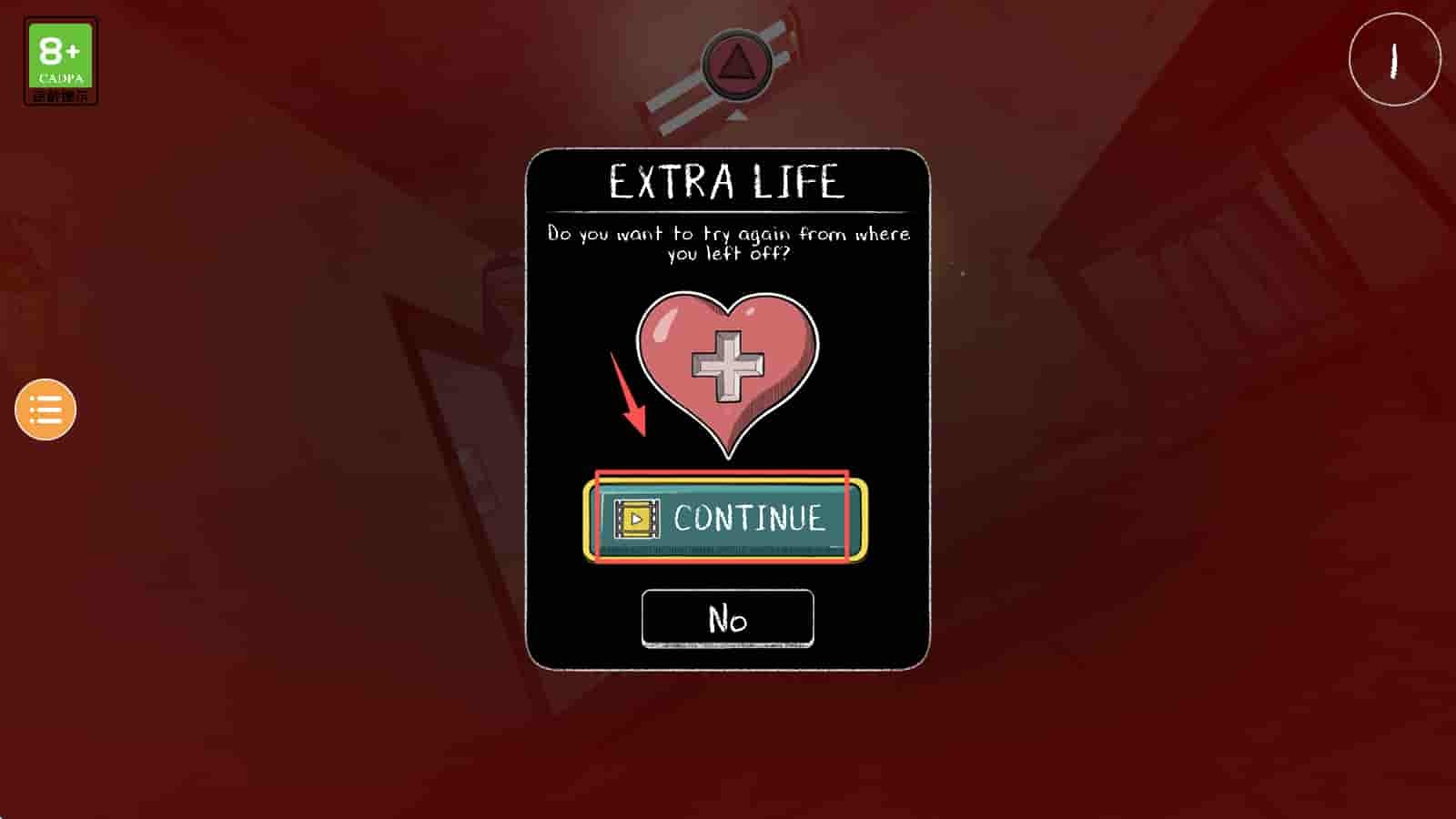 3、游戏失败后选择“CONTINUE”继续,从失败的地方重新开始。
