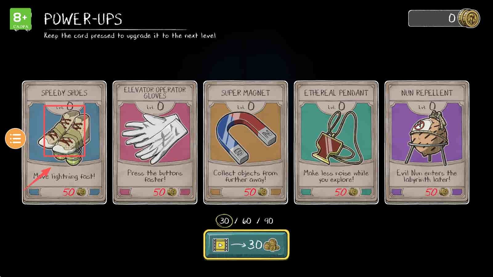 4、在“POWER-UPS”界面,使用金币升级能力,为下一次逃脱做准备。